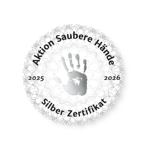 Das Silber-Zertifikat der „Aktion Saubere Hände“ bestätigt die kontinuierliche Umsetzung geprüfter Qualitätsstandards in der Händehygiene.